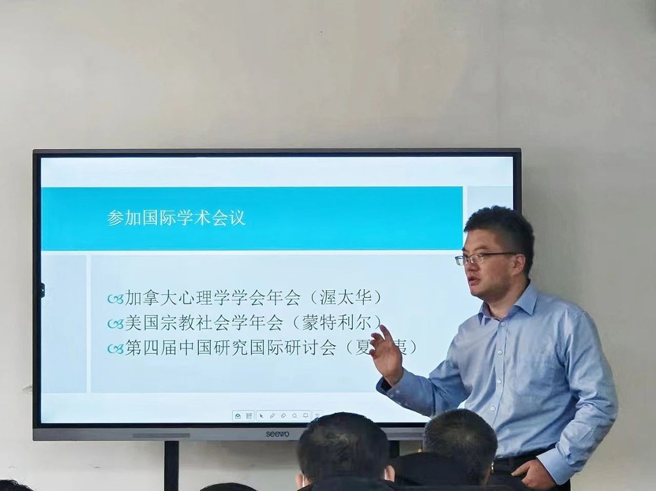 在访学成果展示环节,王超老师以“学术对话”为主线,分享了参与加拿大心理学年会(渥太华)、美国宗教社会学年会(蒙特利尔)及第四届中国研究国际研讨会(夏威夷)的三重学术体验。特别值得一提的是,王超老师拥有加入国际跨文化研究学会(IACR)的学术履历,且在访学期间发表了相关论文。他还展示了访学期间拍摄的众多图片,分享图片背后的故事,极大地激发了与会师生的热情。