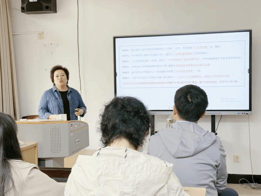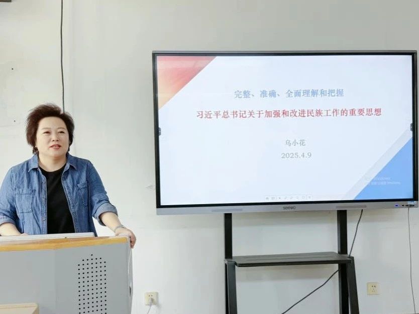 紧接着,乌教授从马克思主义民族理论中国化、时代化的最新成果视角出发,通过罗列历史史实、实际数据等方式,详细剖析了习近平总书记关于加强和改进民族工作的重要思想。讲解内容涵盖全面、内容丰富,她指出,这一重要思想归纳提炼了党的民族工作理论和实践经验,深刻揭示了中华民族发展的内在规律,科学回答了新时代党的民族工作举什么旗、走什么路的根本问题。