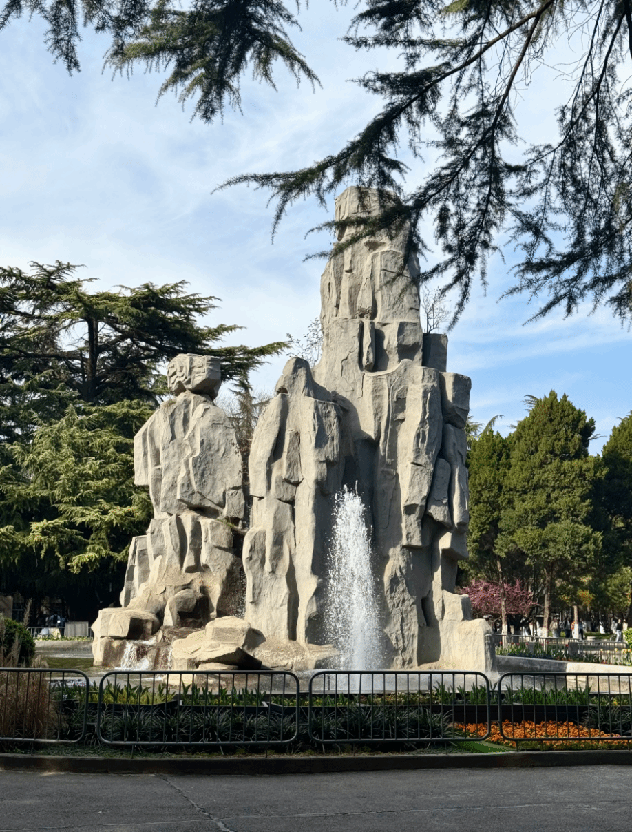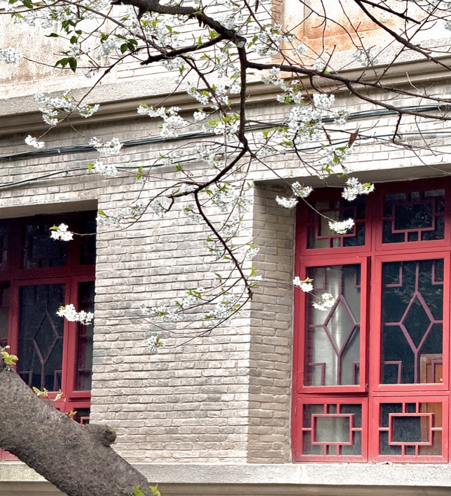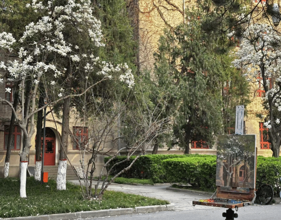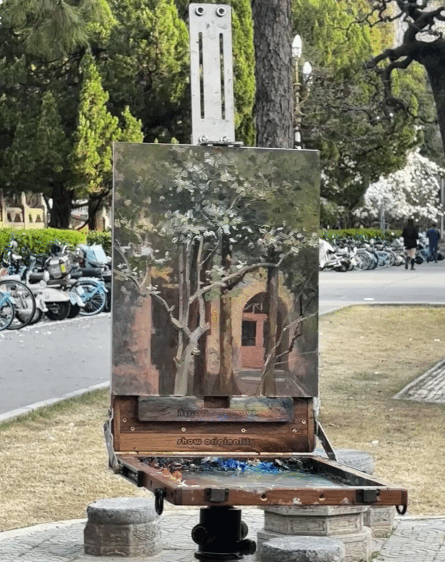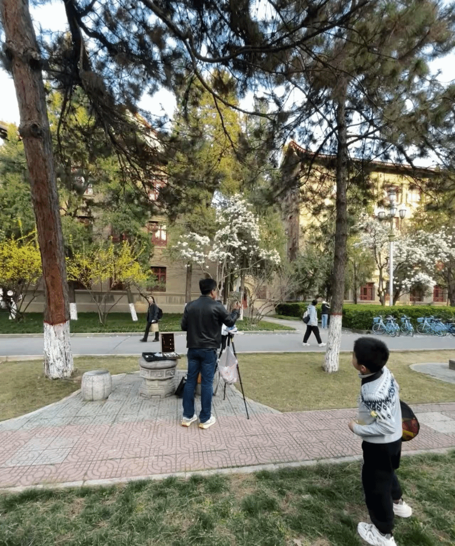 一位画家带着画板,在图书馆的窗边试图用画笔将春天装进油画里,作画时,他的手上似乎沾着白玉兰的花粉。周围好奇的学生观众们逐渐增多,我与他们一起见证了油画作品里玉兰花与真实落花的神奇重叠。围观人群很多,一个小男孩也专门凑过来,只见他踮起脚尖,试图触碰到油画。此时,画家将笔倾斜,所有人的影子在这一刻竟然都融进了画框里。在我拍照的一瞬间,画家严谨又柔和的笔触、孩童发梢的油彩与镜头里的春色,在百年学府的石墙上,完成了三代人关于美与传承的三重奏。