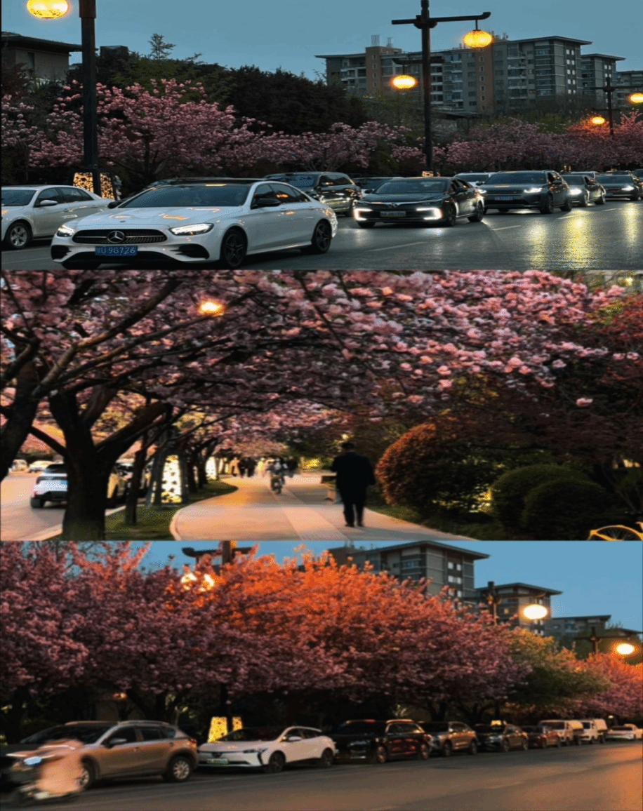 2025年4月5日,傍晚,骑行去曲江池西路看樱花,坐在旁边的长凳上看着来来回回的车辆和人行道上行走的路人,樱花开得正盛,大家纷纷拍照打卡,试图想留存这份美好的瞬间。于是,我也拿出手机拍了几张樱花树,拍完后发现这个画面很美好,我想,这应该就是我们记录生活的意义。那天傍晚,我们在樱花树下共同拥有了这一刻,樱花的美丽正是幸福的具象,愿年年盛放、年年相见。