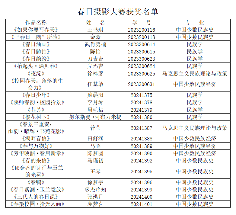 经评审筛选,最终评选出22份优秀作品。本次摄影大赛所有获奖作品将在学院公众号分上下两期进行展示,以下是本次摄影大赛的获奖名单:(排名不分先后,按学号顺序进行排序)