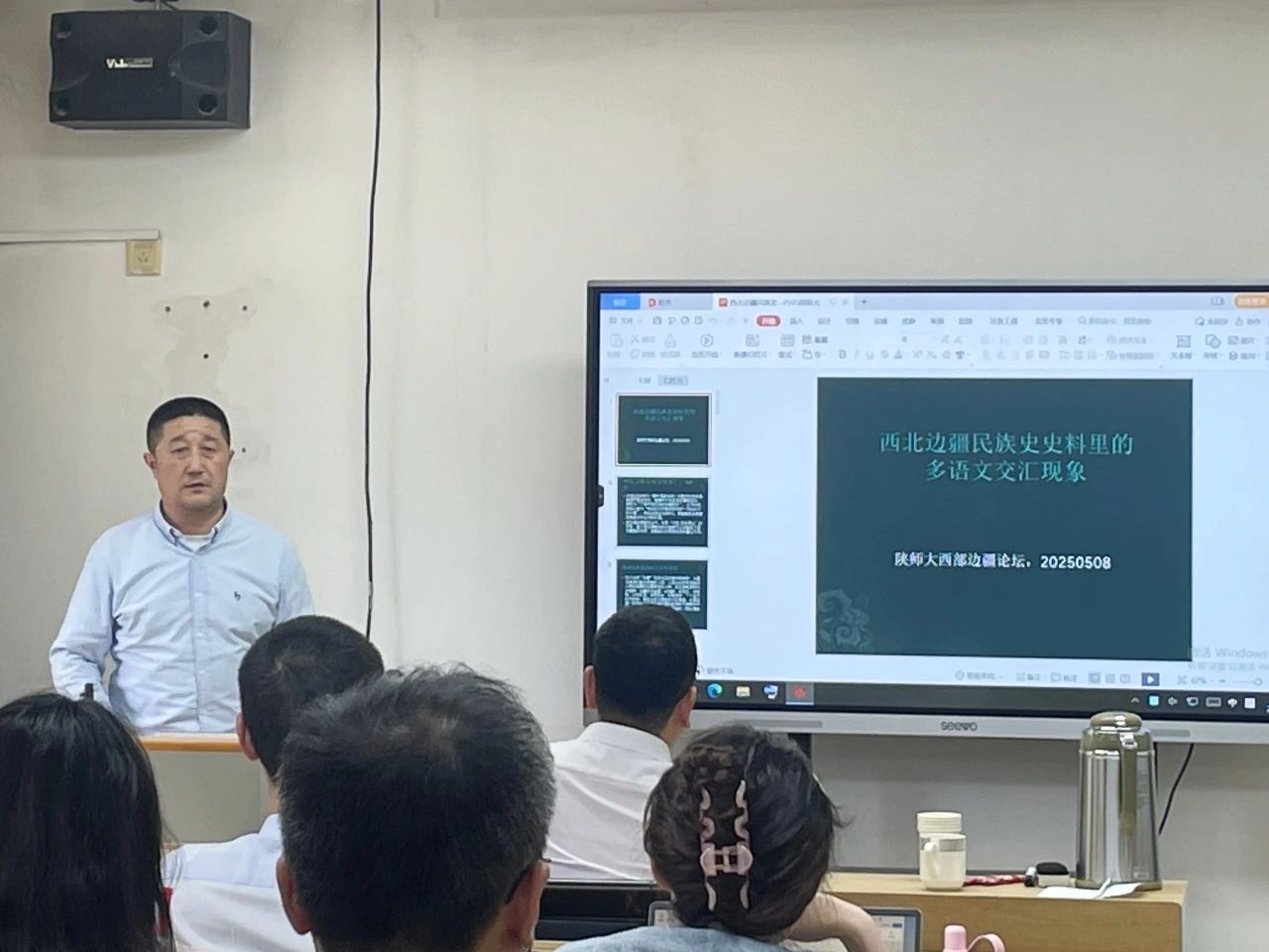2025年5月9日下午14:30,中国西部边疆研究院在雁塔校区文科科研楼312教室成功举办“西部边疆讲坛第96讲”。特木勒教授以《西北边疆民族史史料的多语文交汇现象》为题,与边疆研究院师生们展开交流,研究院徐百永教授主持本次讲座。