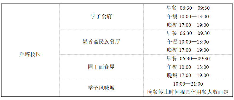 师大雁塔校区的食堂有学子食府、园丁面食屋、桃李园以及民族餐厅墨香斋,各食堂餐厅配套设施完善,饭菜品种齐全,可满足大家不同的味蕾体验。
